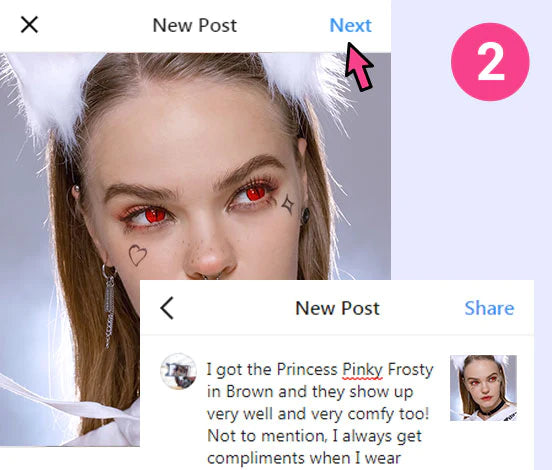 - Mach ein Foto von dir, wie du unsere Linsen trägst. Schreibe in die Bildunterschrift unbedingt die Linsen, die du trägst, und eine kurze Bewertung dazu.