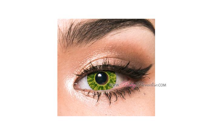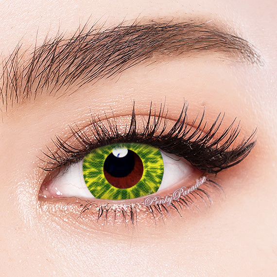 Inspired by the bright and big eyes of the characters from Avatar movie, these beautiful contact lenses have a shade of yellow, with a green sun-burst detailing protruding out from the pupil to imitate the captivating eyes of the Na'vi. These lenses make bold changes in your eyes and are perfect for an Alien look, Halloween costume and cosplay characters with yellow eyes.