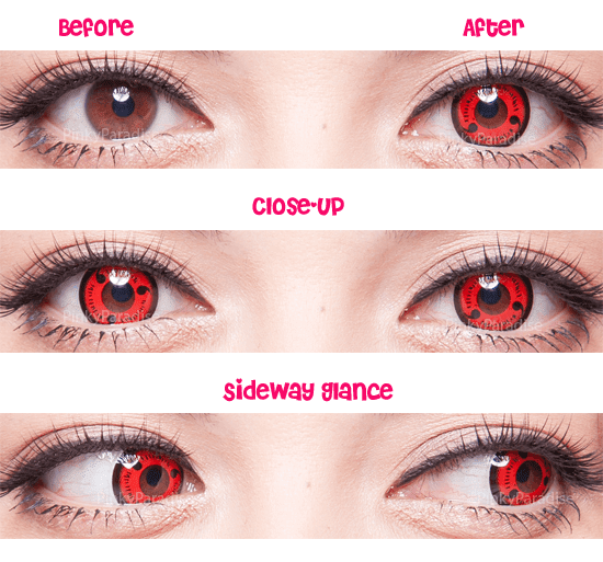 This colored contacts can be used as Cosplay Contacts for character Sasuke Uchiha, Itachi uchiha, Kakashi Hatake, Sarada Uchiha, NRT, Obito Uchiha, Madara Uchiha, Akatsuki, Shisui Uchiha and Izuna Uchiha.Lens Info