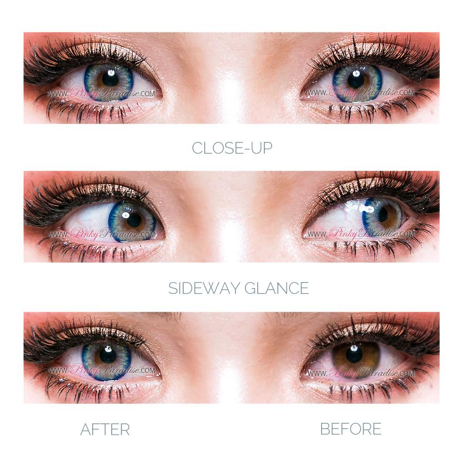 A dramatic fav! Aqua blue has a super bright grayish blue color with deep blue limbal ring that really stands out, perfectly mimicking a fantasy effect. These lenses blend perfectly with light eyes and cover dark eyes extremely well.