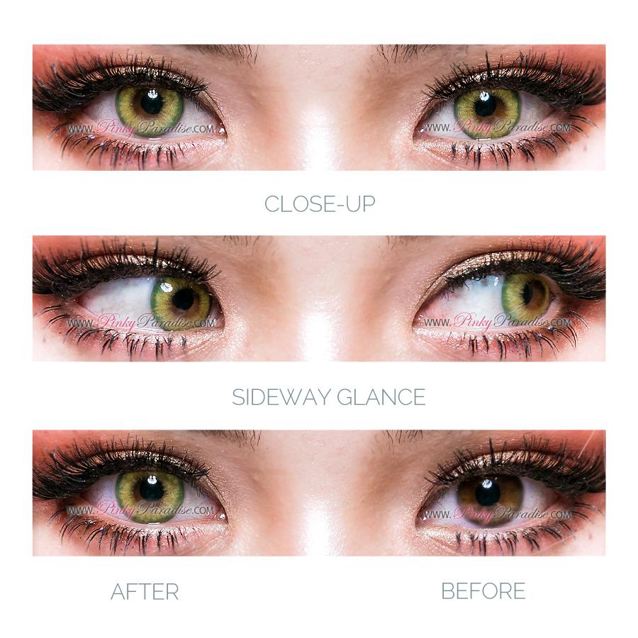 Embrace the extraordinary. The unique khaki color with a deep green limbal ring will give you a dangerously bold eye that compliments any look. For the super bright green eyes, these are the ones for you! These lenses blend perfectly with light eyes and cover dark eyes extremely well. Perfect for creating that Maleficent look!