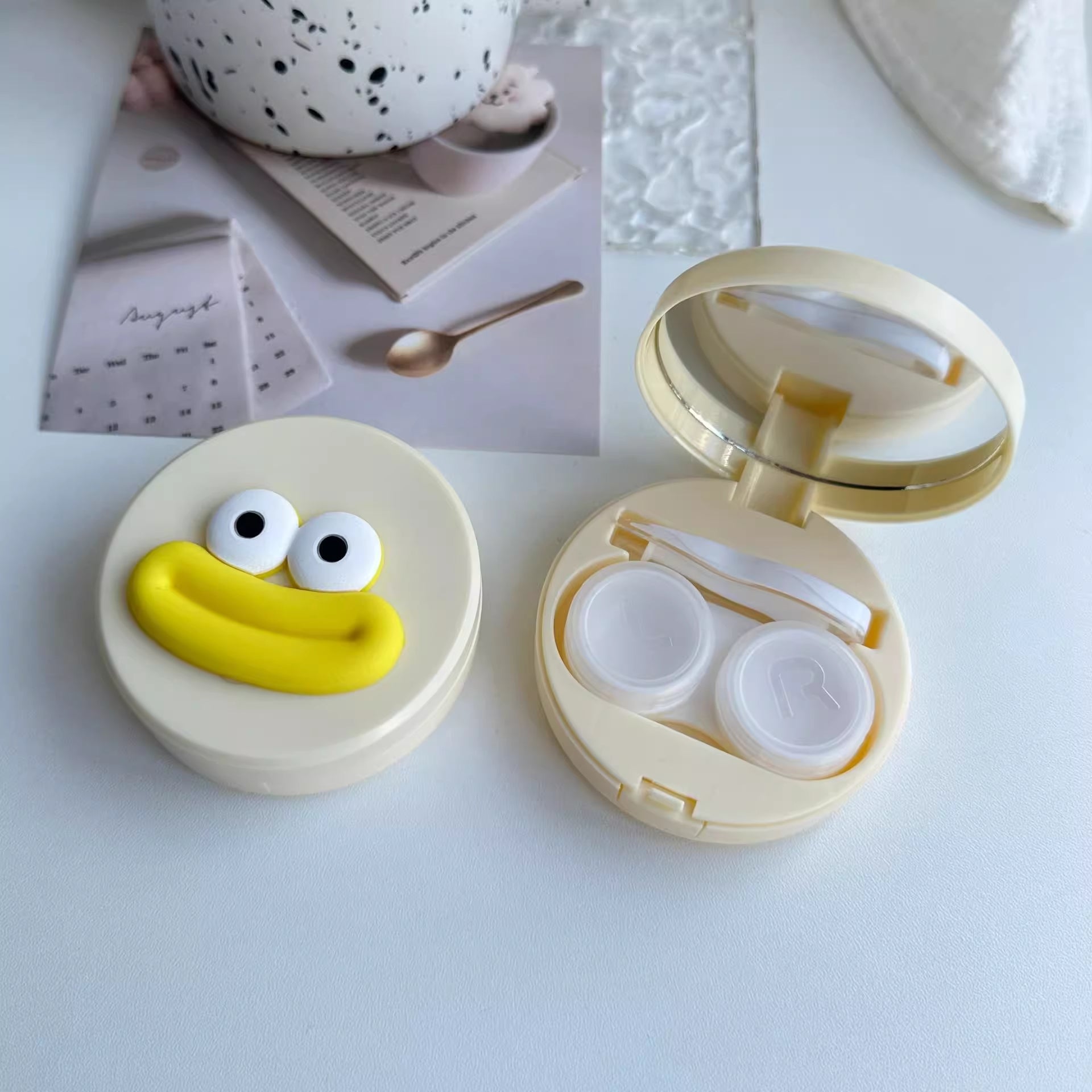 Titta på de där stora ögonen och fylliga läpparna – är de inte bara så söta? Det här resefodralet för linser är inte bara bedårande utan också superpraktiskt! Det levereras med inbyggd spegel, en linstång, en linsinsättare och ett linsfodral med halvgenomskinligt lock.