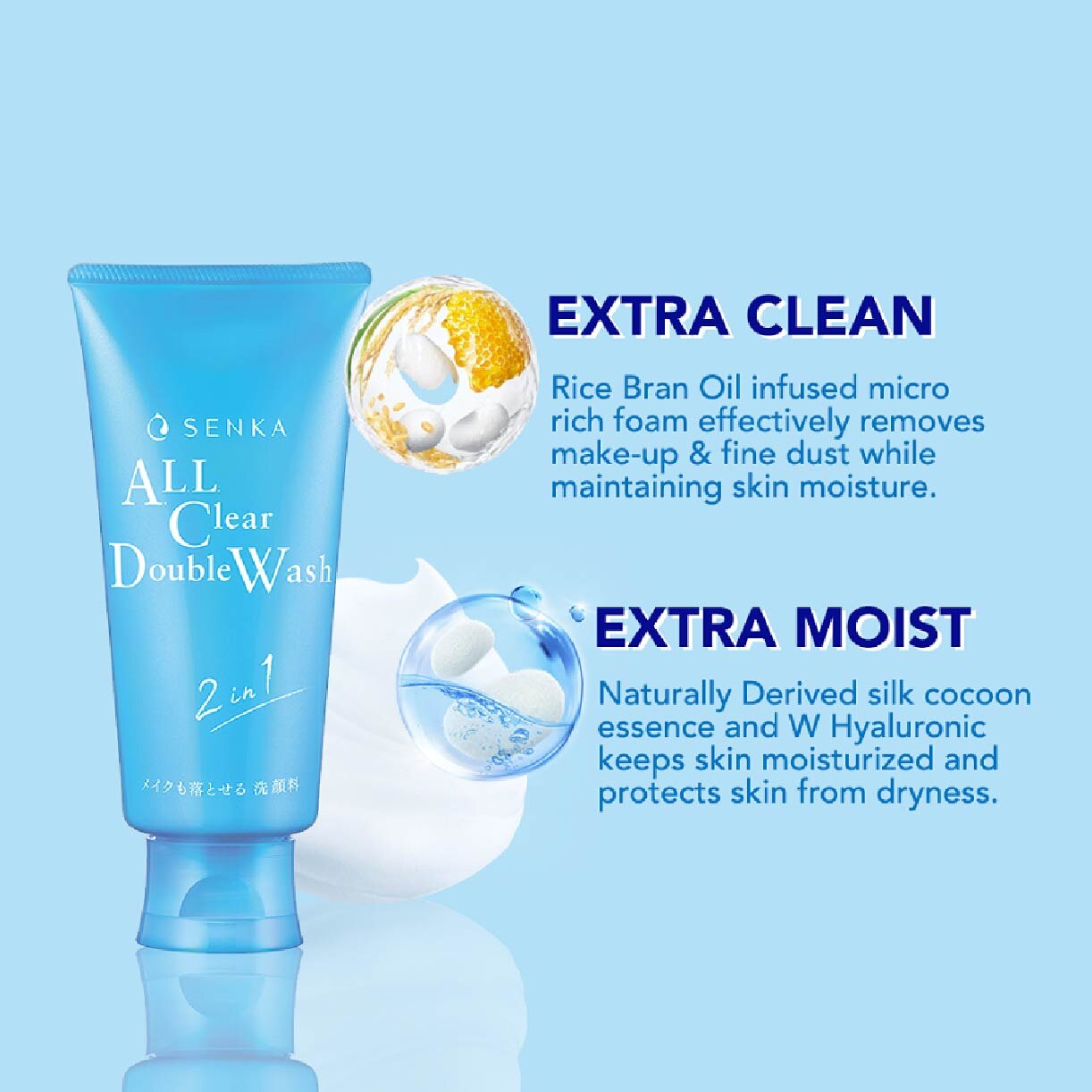 SENKA 清透双效洁面泡沫是一款二合一卸妆与洁面产品,丰富泡沫能去除淡妆和肌肤杂质。蕴含日本传统成分米糠油与绚韵标志性蚕丝蛋白精华,改善配方助力肌肤健康,有效溶解黑头、皮脂和污垢。